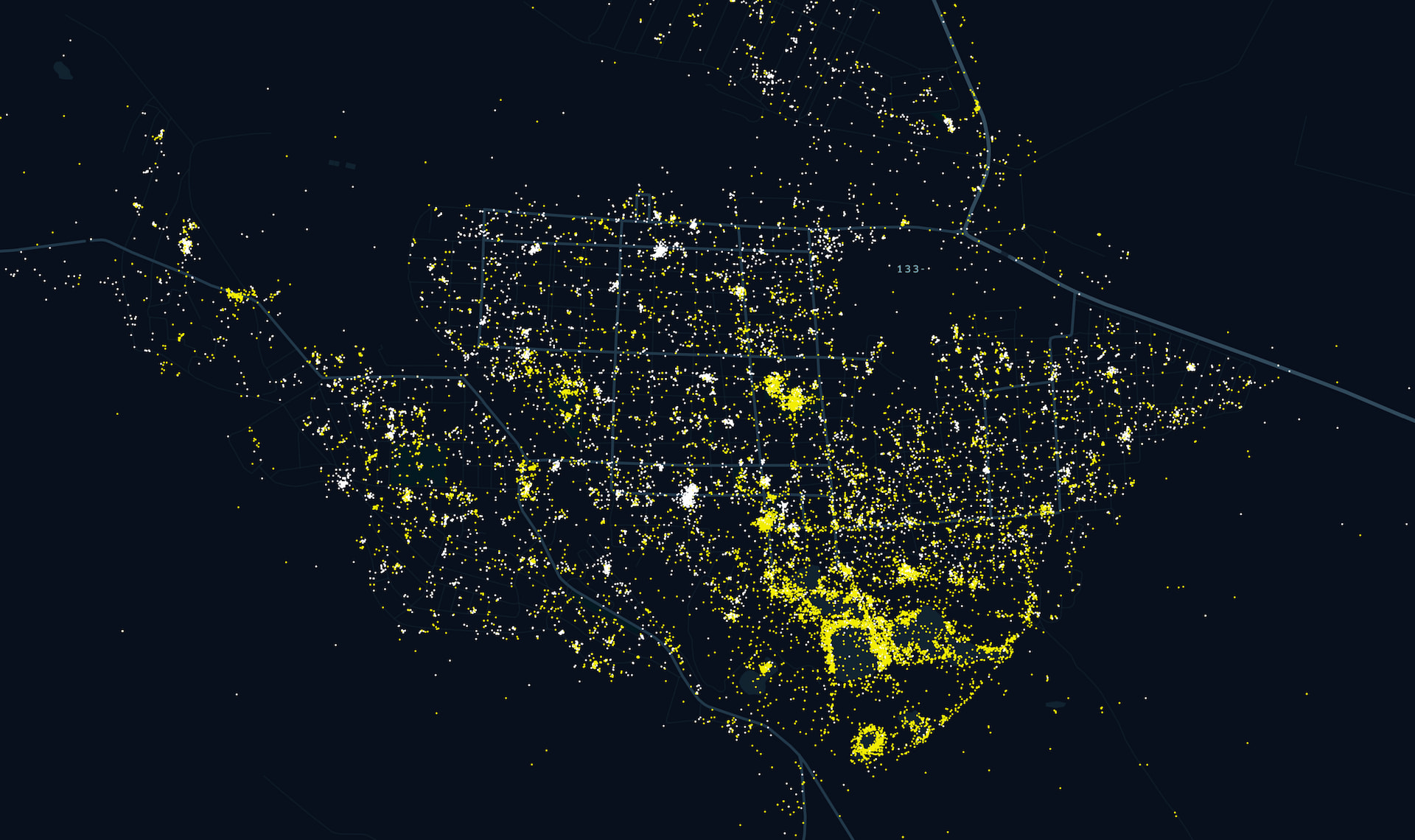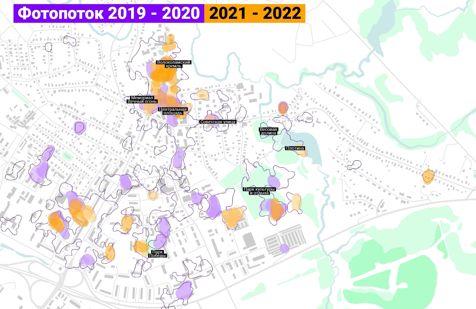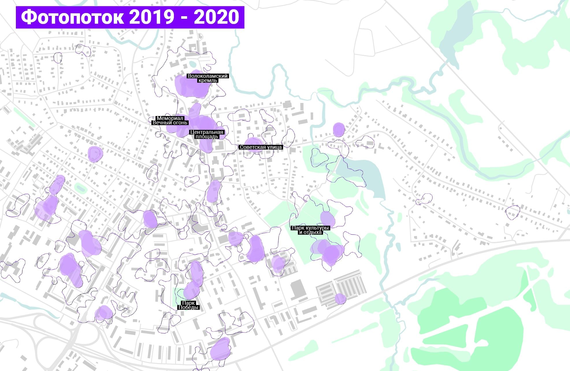 На основе кластеризации географических координат изображений формируется тепловая карта распределения фотографий городской среды. Карта наглядно показывает распределение наиболее популярных и фотографируемых мест, выявляет главные и локальные точки притяжения и их взаимосвязи: отдельные кластеры и системы пространств. Такой подход позволяет получить объективный срез социальных данных: непредвзятая социальная оценка (мнение пользователей) в отношении обозначенных проектных запросов, т.е. тепловая карта показывает существующий социально-культурный каркас рассматриваемой территории.