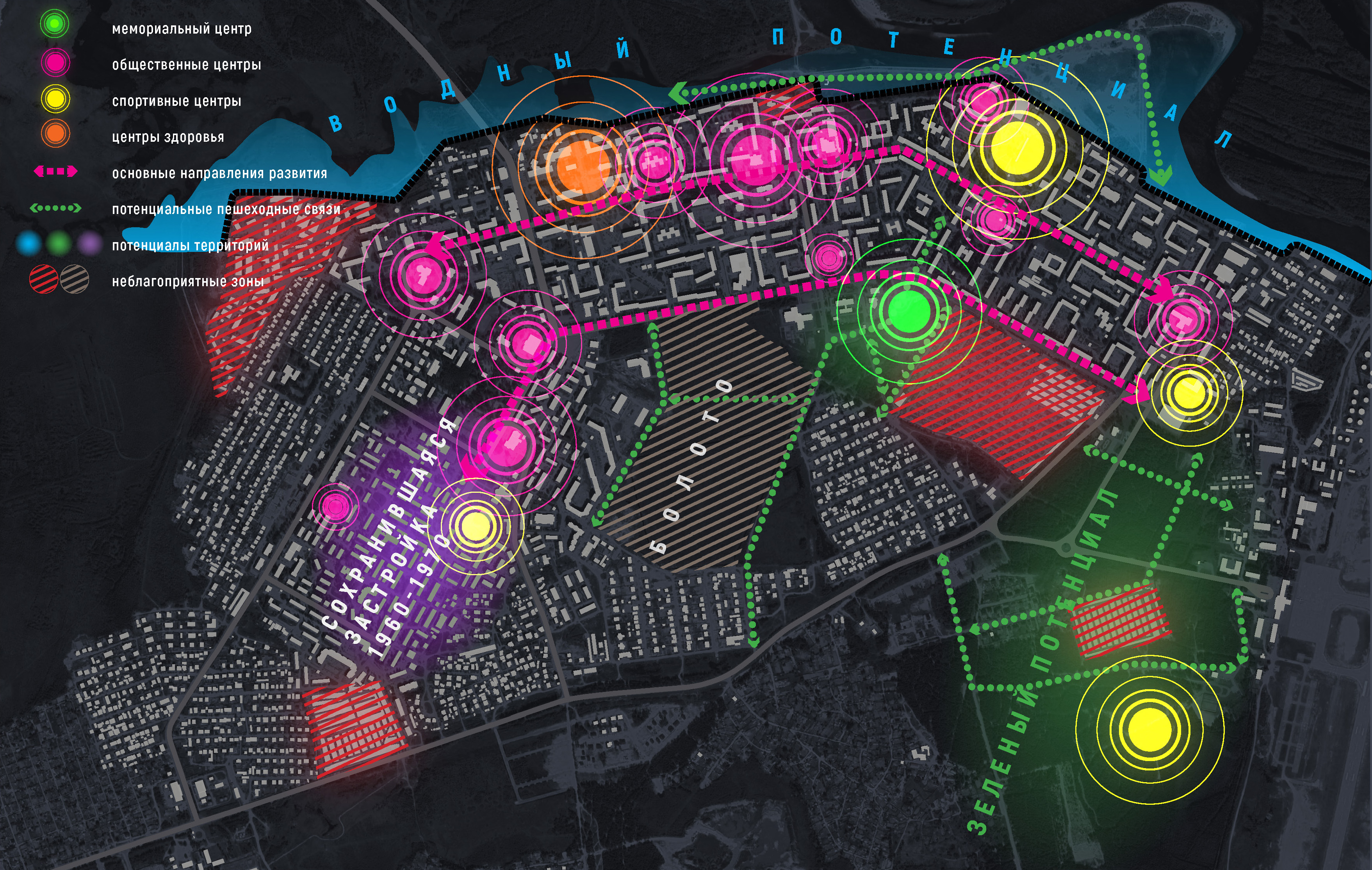Так же обозначены негативные факторы городской среды: болото и гаражи, которые препятствуют созданию пешеходных и транспортных связей между районами юго-восточной части города. Отсутствие оборудованной транспортной и вело-пешеходной дорожной сети и разорванность городской ткани в юго-восточной части города в совокупности оказывают мощное негативное влияние на безопасность в городе.