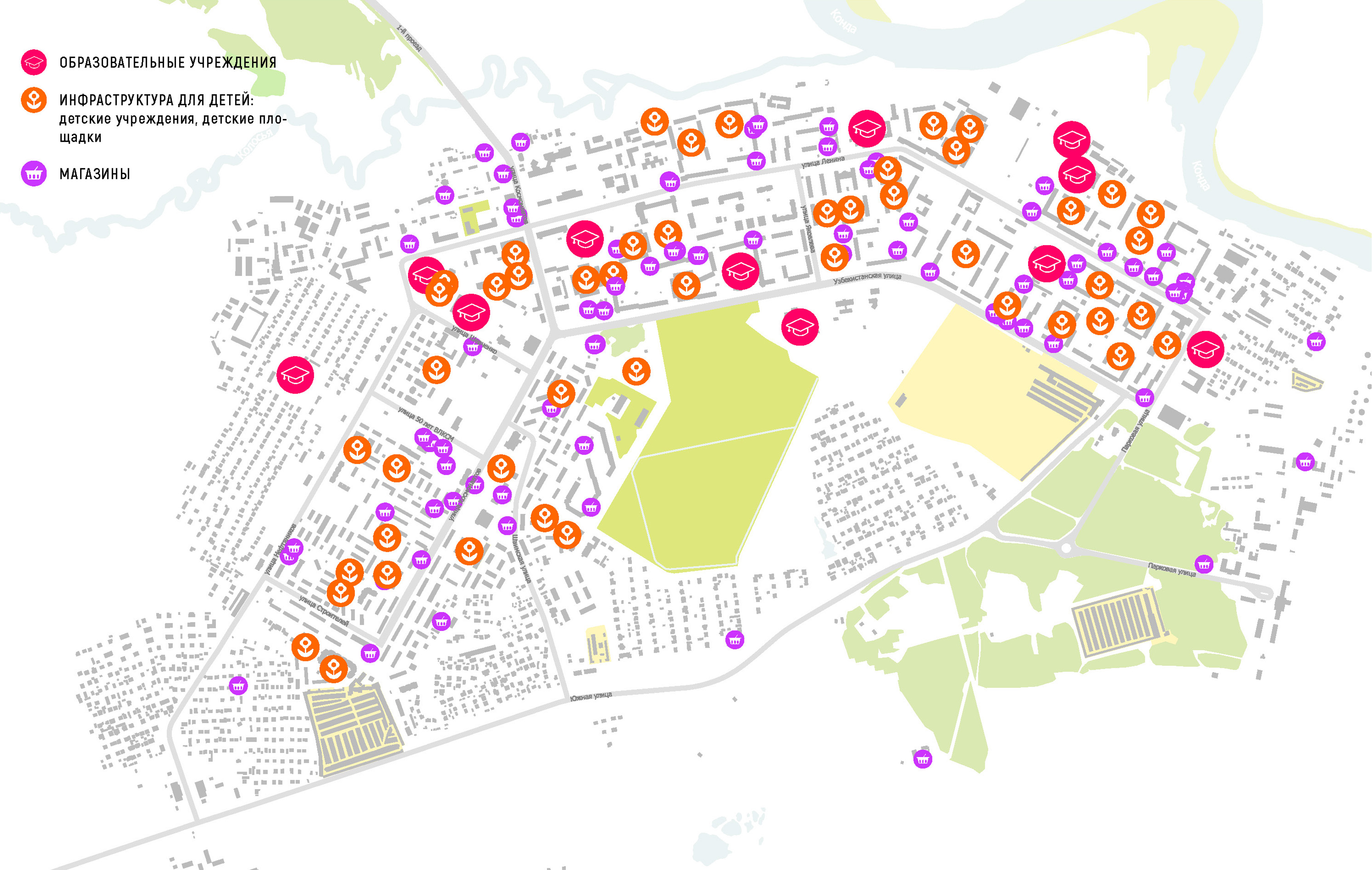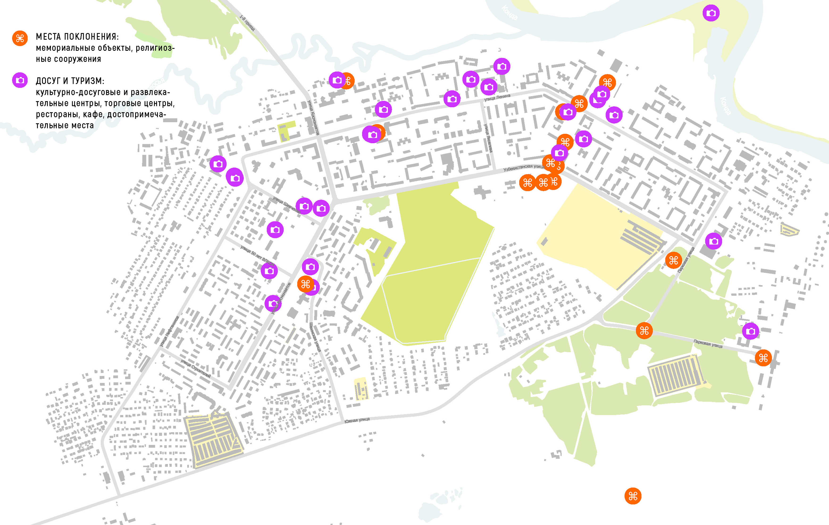 - набережная — по мнению горожан одна из наиболее популярных мест. При этом стадион «Нефтяник» является мощной точкой притяжения для молодежи всего города. Набережная как главная природная территория стала излюбленной зеленой зоной для прогулок в тишине, для наблюдения за флорой и фауной района, для любования речной долиной Конды. Вместе с территорией Спортсквера (часть парка культуры и отдыха), где можно найти точки общественного питания и необходимые инфраструктуры. Набережная — перспективная территория для развития рекреационной зоны в центре города.