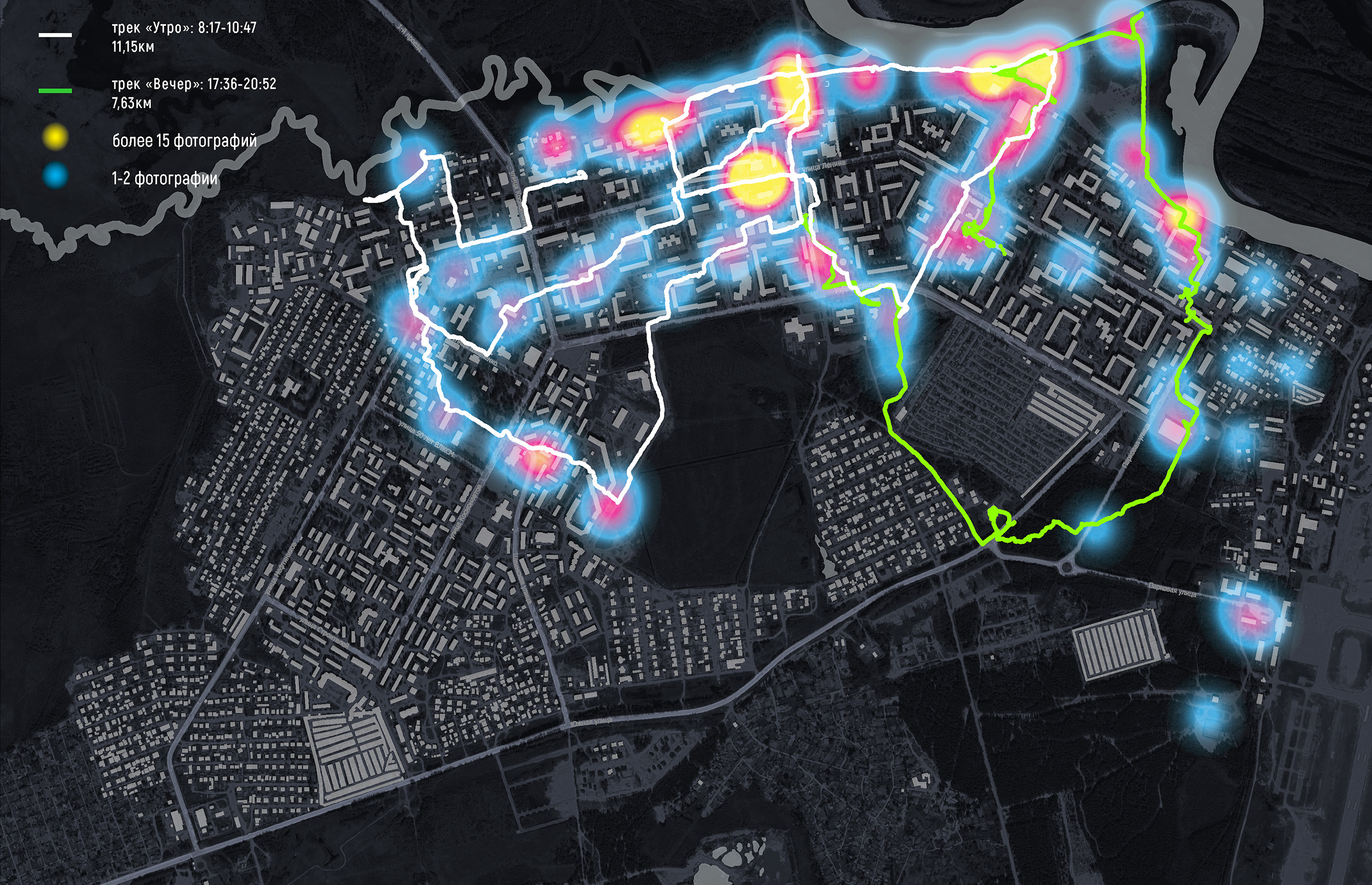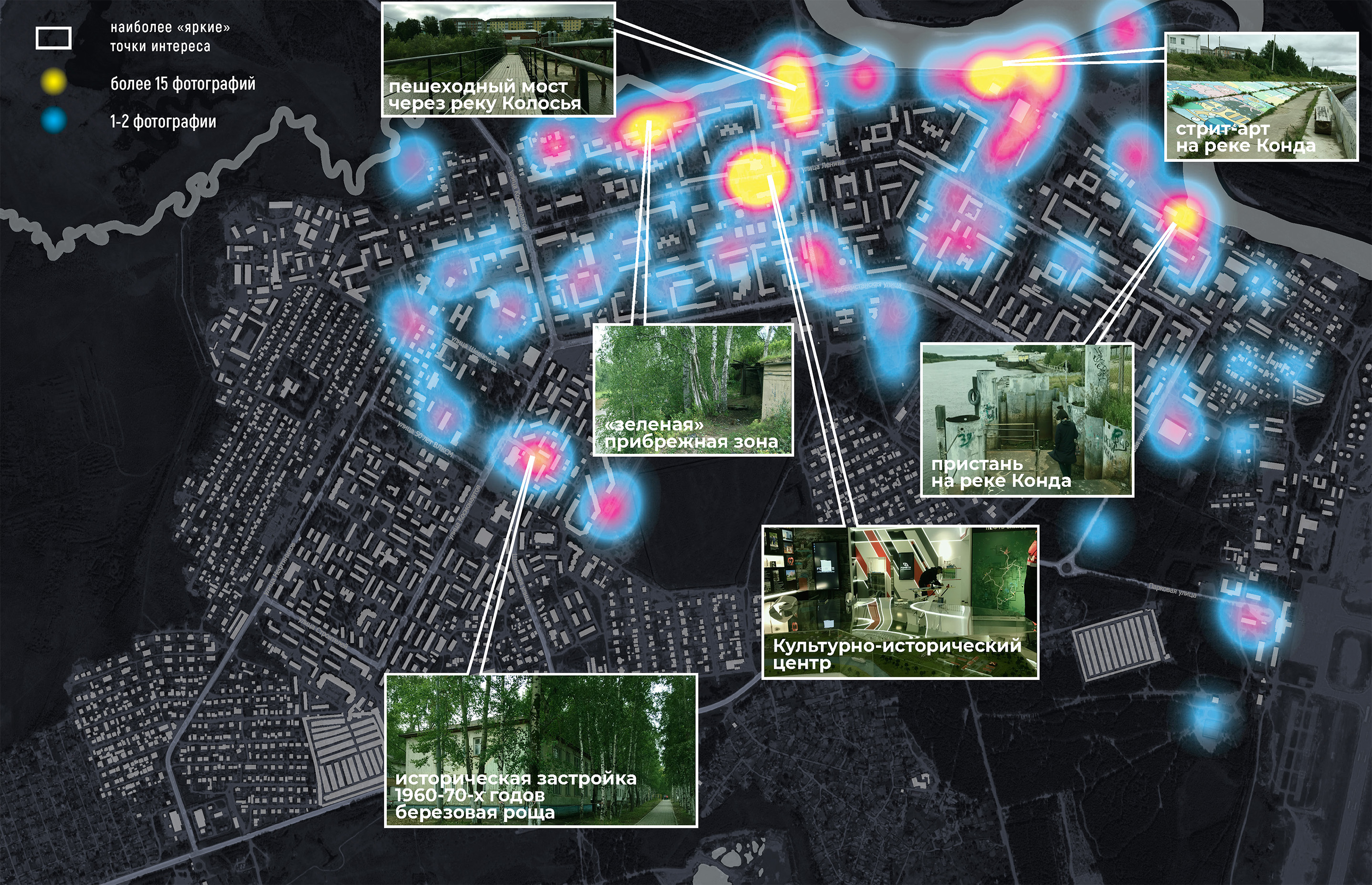 По геопривязанным фотографиям построена тепловая карта, отражающая количество сделанных фотографий в каждом месте съемки. Количество сделанных фотографий в том или ином месте может свидетельствовать о его уникальности, значимости, потенциале, явных положительных или отрицательных свойствах с точки зрения наблюдателя. Это позволяет строить гипотезы о наличии как локальных точек интереса, так и целых территорий с сильным потенциалом развития.
