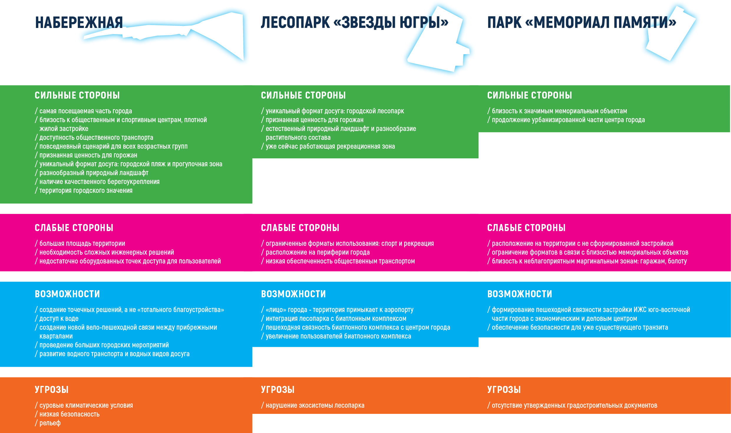 - лесопарк «Звезды Югры» — излюбленная зеленая зона для прогулок в тишине. Как большая территория с разнообразием растительного состава в относительной близости от Центра города «Лесопарк» претендует на звание Городского парка. По результатам опроса около половины жителей выбрали природные территории, аргументируя это тем, что «в городе нет лесопарковых благоустроенных зон». При разработке комплекса мер по благоустройству необходимо предусмотреть решения, максимально сохраняющие сложившийся природный ландшафт.