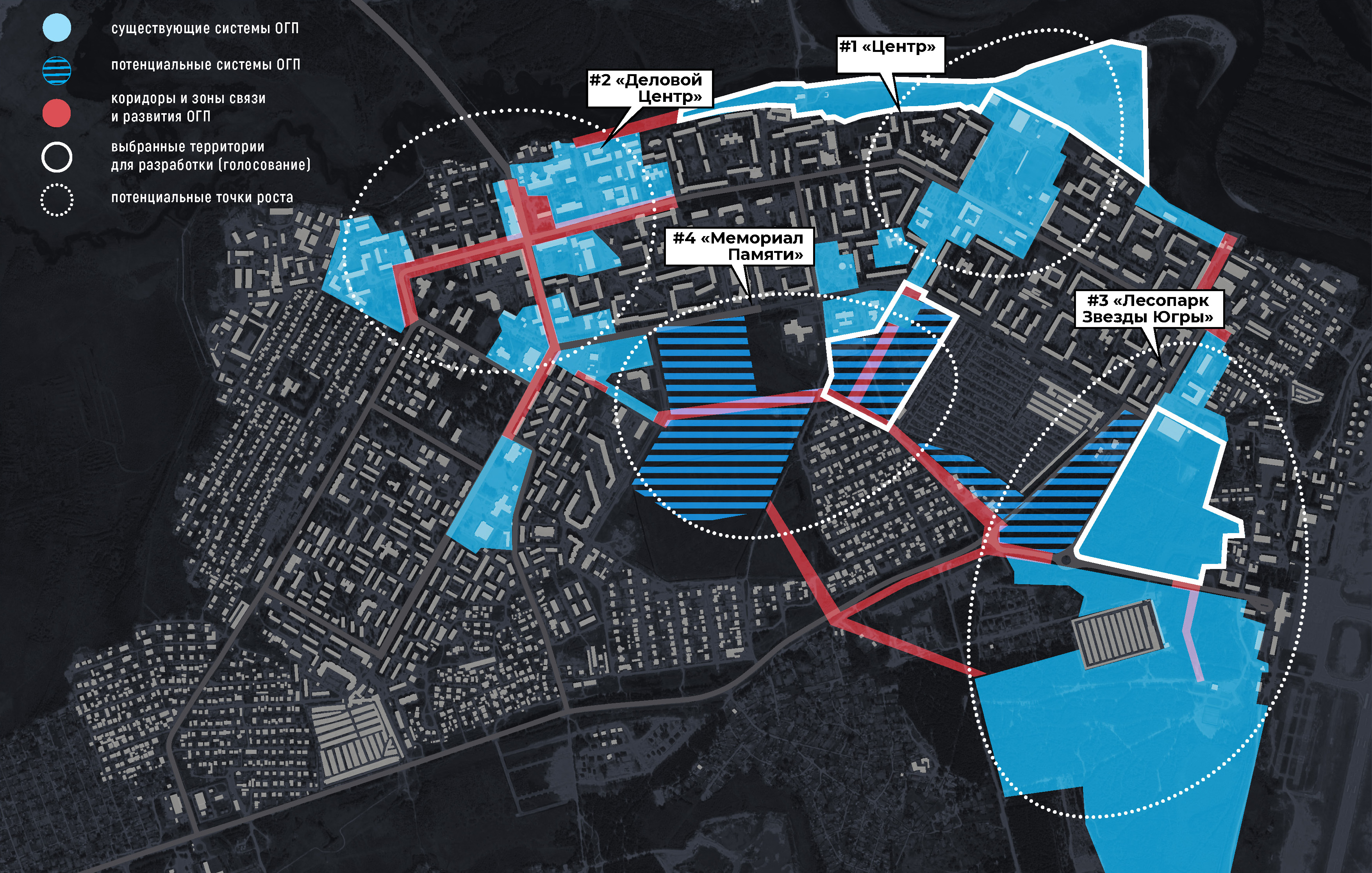 На основании градостроительных документов и предложений горожан, поступивших в 2018 году при проведении мероприятий приоритетного проекта ФКГС, была сформирована схема общественно-деловых и рекреационных зон города. Дистанционный анализ данных позволяет говорить о наличии четырех потенциальных систем открытых городских пространств (далее ОГП), для формирования которых необходимы вело-пешеходные связи.