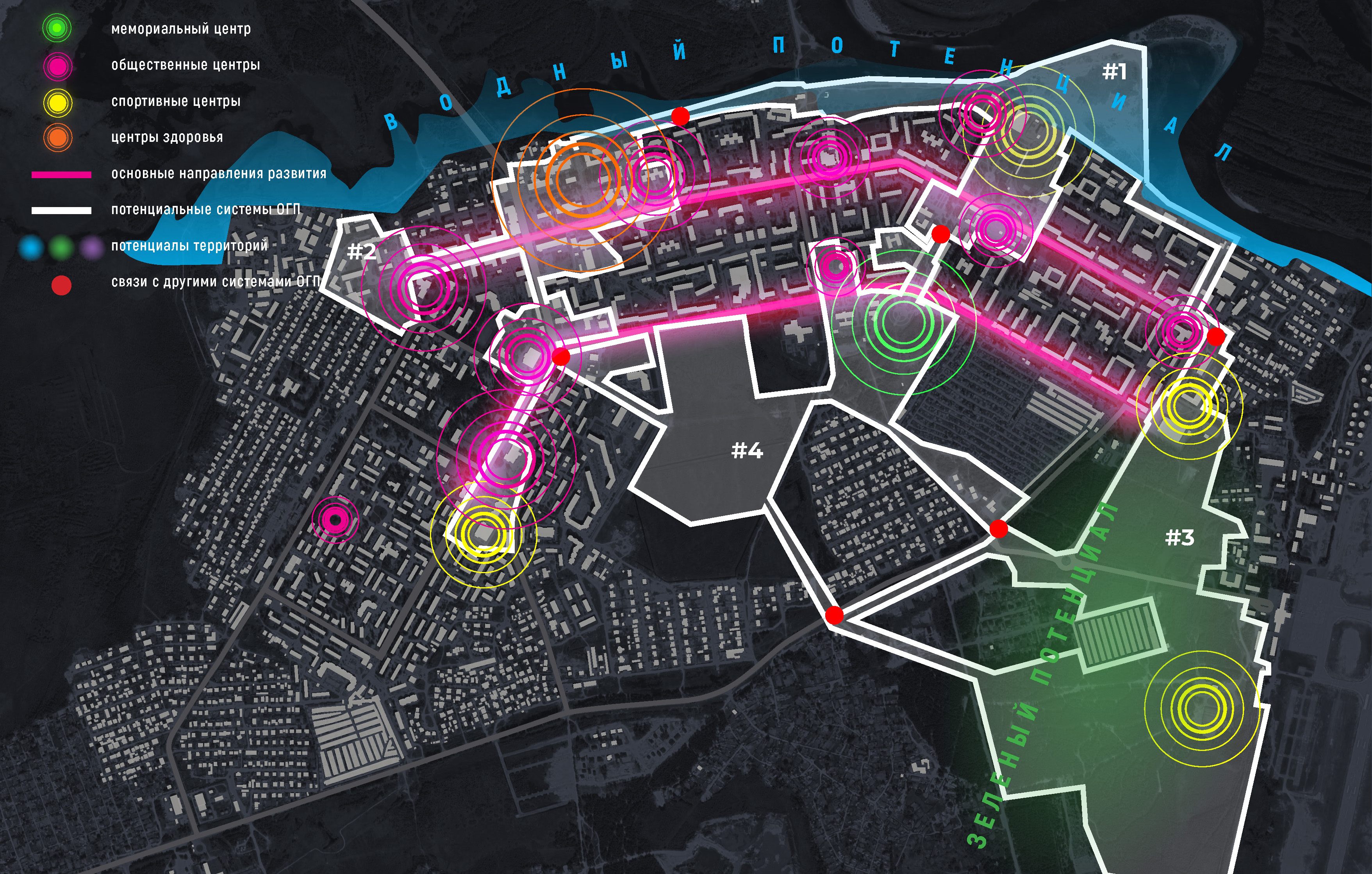 В ходе детализации компонентов потенциальных точек роста определены границы систем ОГП и связи между ними. Детальный анализ каждой из систем позволит прогнозировать развитие общественных пространств города, усиливая положительные характеристики каждого из центров и нивелируя негативные аспекты, возникающие в городской среде.